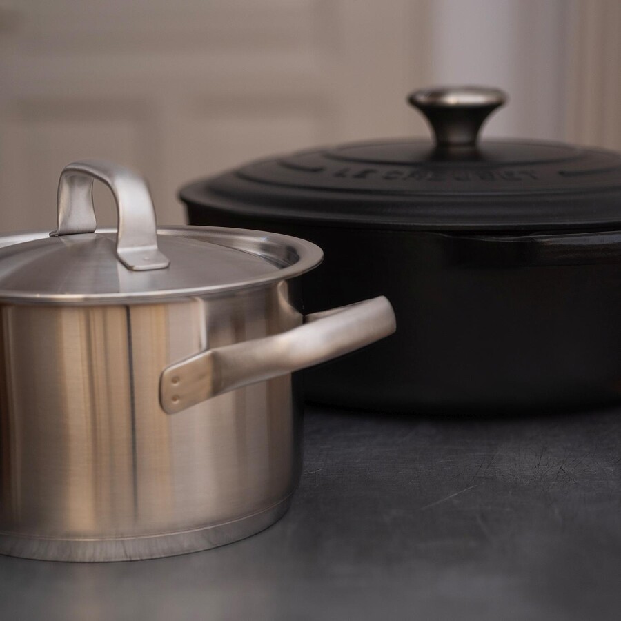 Edelstahl, Gusseisen, Emaille oder Aluguss – welcher Topf ist am besten? Auf jeden Fall der mit dem besten Boden. Dieser muss dick sein und beim Erhitzen plan auf dem Kochfeld aufliegen. Nur dann kann die Wärme gleichmäßig verteilt werden. Gute Ergebnisse erzielt man mit einem Sandwichboden, der aus verschiedenen Schichten aufgebaut ist.