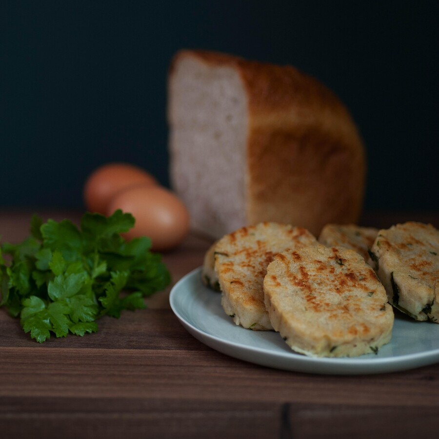 Dünsten Sie eine feingehackte Zwiebel in zwei Esslöffeln Butter an. Löschen Sie das Ganze mit 250 ml heißer Milch ab, würzen mit Salz, Pfeffer und Muskat und gießen diese Masse über das Knödelbrot. Noch einen halben Bund feingehackter Petersilie sowie zwei Handvoll Semmelbrösel dazu geben und eine halbe Stunde ziehen lassen.
